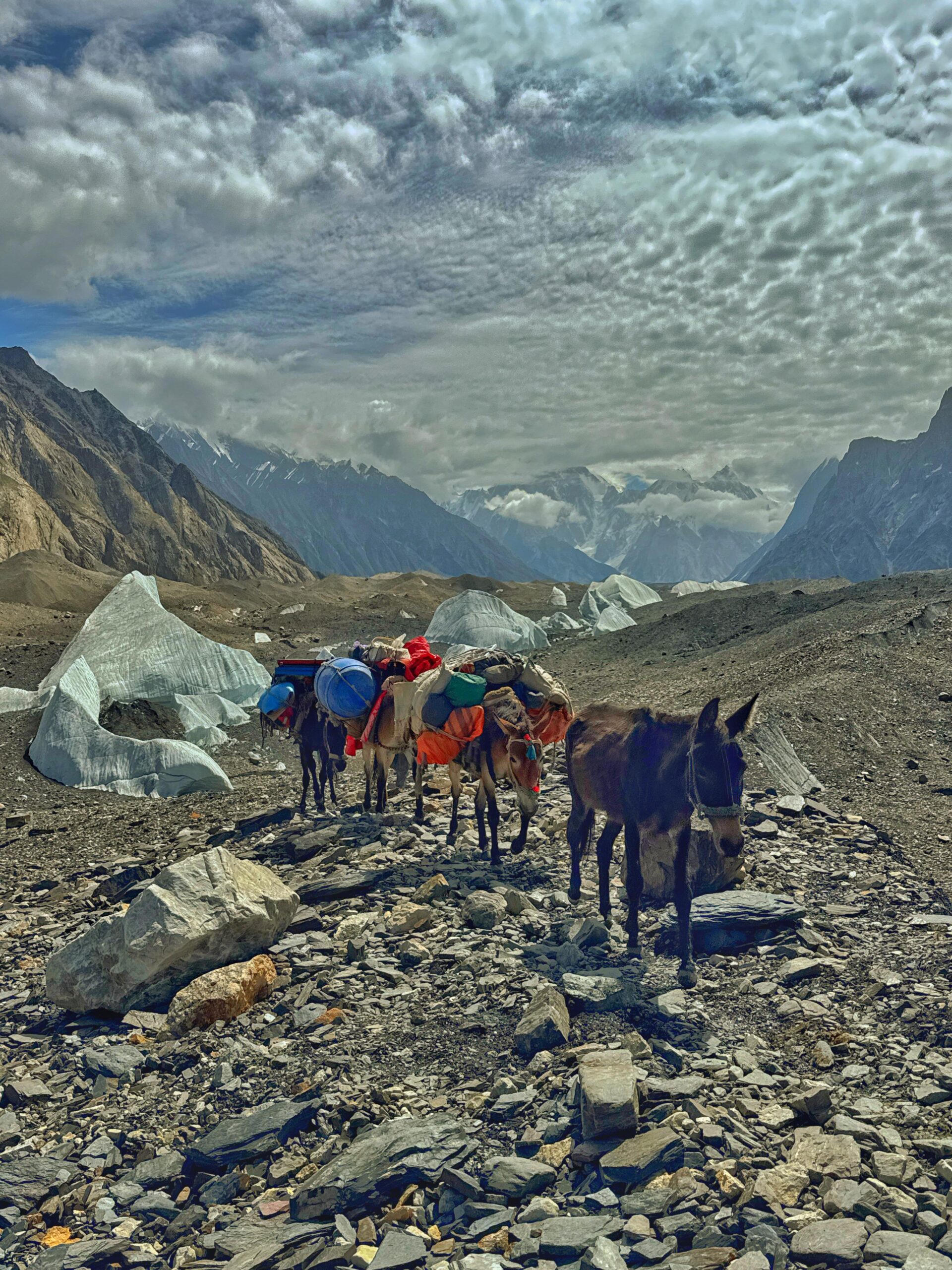 The first rule of trekking K2 Base Camp is to step to the wall side when you meet a mule, since otherwise you can be knocked off the edge.